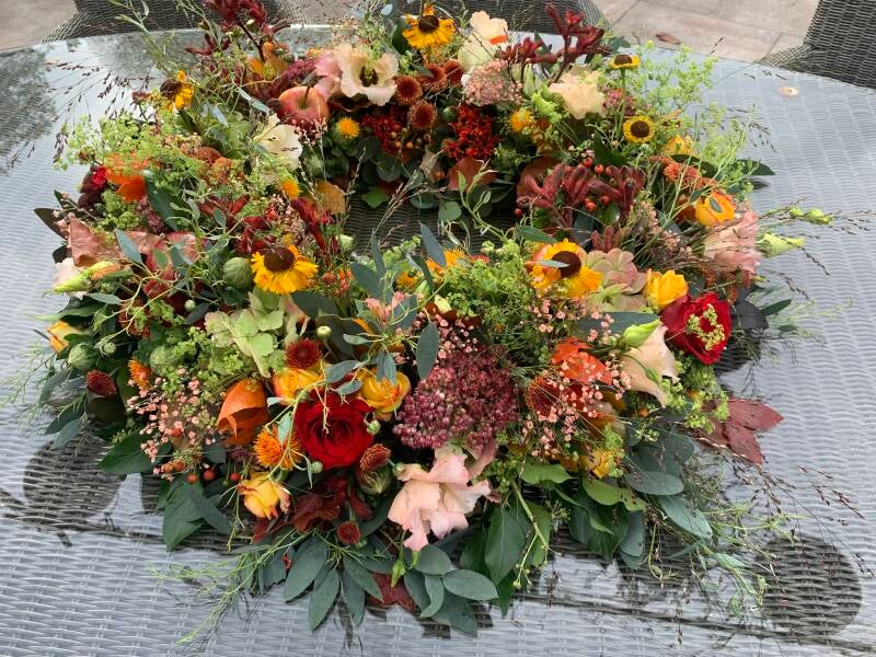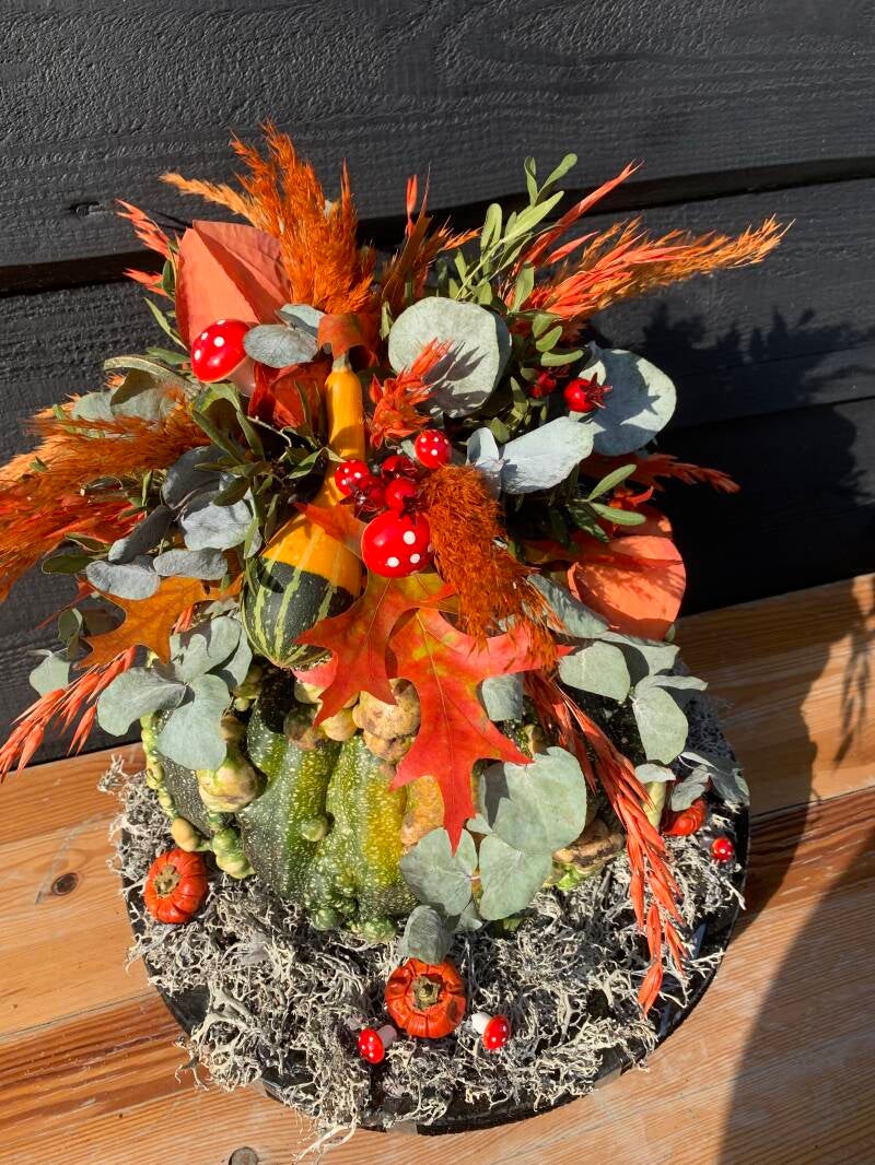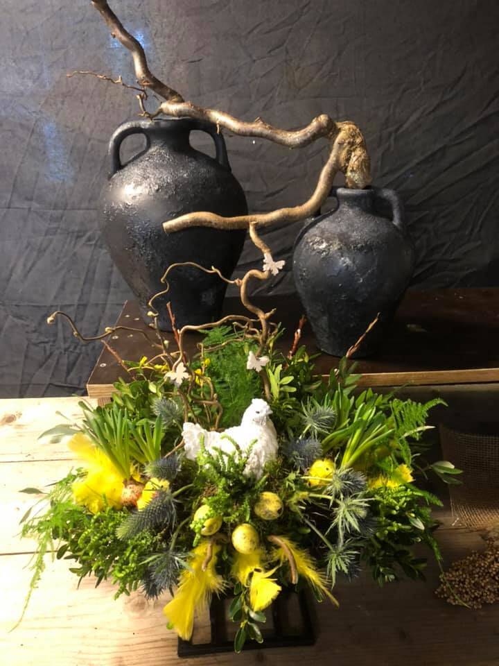 metalen ring op pootje met droog materialen en eucalyptus wat mooi indroogt.